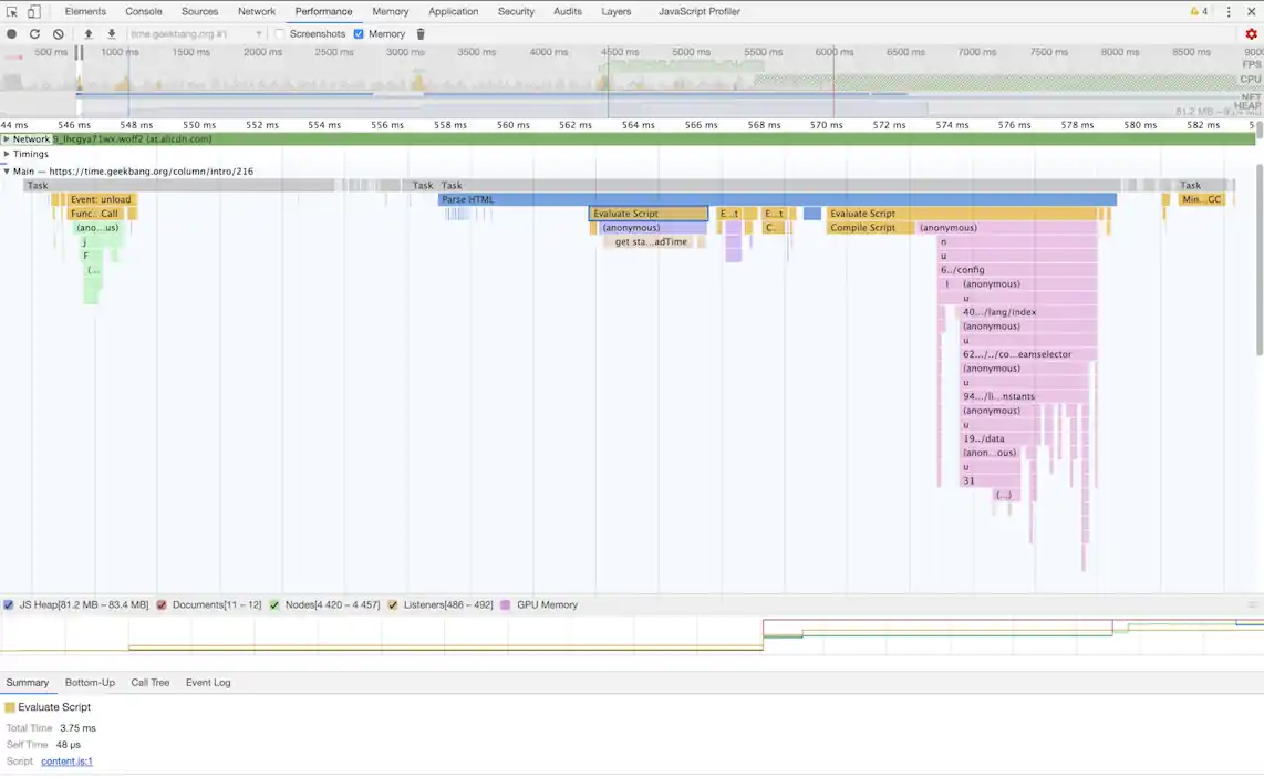 从图中可以看出,我们点击展开了 Main 这个项目,其记录了主线程执行过程中的所有任务。图中灰色的就是一个个任务,每个任务下面还有子任务,其中的 Parse HTML 任务,是把 HTML 解析为 DOM 的任务。值得注意的是,在执行 Parse HTML 的时候,如果遇到 JavaScript 脚本,那么会暂停当前的 HTML 解析而去执行 JavaScript 脚本。