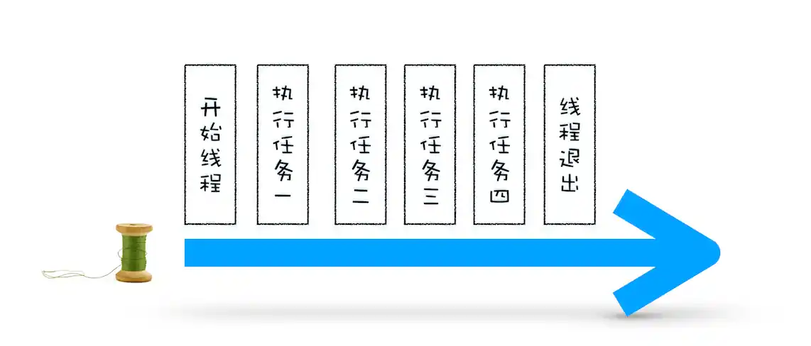 }在上面的执行代码中,我们把所有任务代码按照顺序写进主线程里,等线程执行时,这些任务会按照顺序在线程中依次被执行;等所有任务执行完成之后,线程会自动退出。可以参考下图来直观地理解下其执行过程: