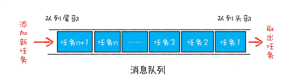 }在上面的代码中,我们添加了一个消息队列的对象,然后在主线程的 for 循环代码块中,从消息队列中读取一个任务,然后执行该任务,主线程就这样一直循环往下执行,因此只要消息队列中有任务,主线程就会去执行。主线程的代码就这样改造完成了。