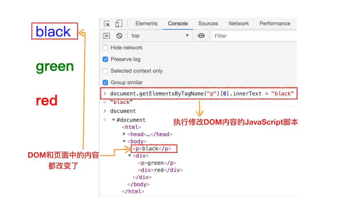 document.getElementsByTagName("p")[0].innerText = "black"这行代码的作用是把第一个标签的内容修改为 black,具体执行结果你可以参考下图: