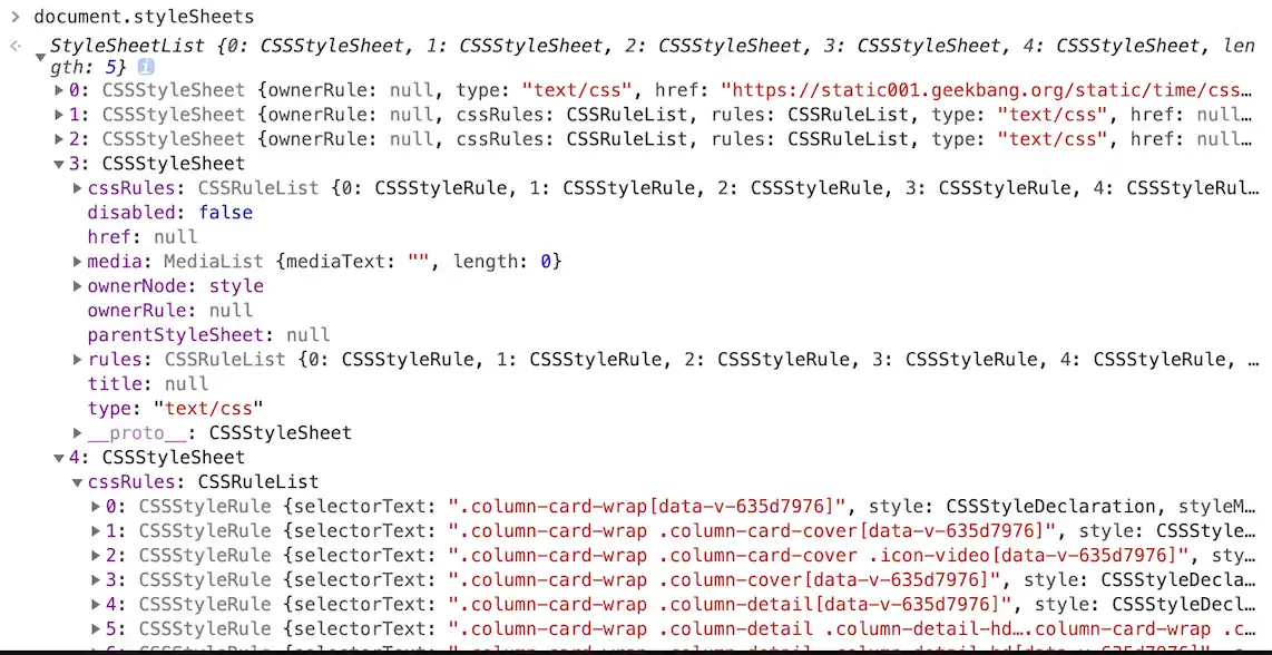 为了加深理解,你可以在 Chrome 控制台中查看其结构,只需要在控制台中输入 document.styleSheets,然后就看到如下图所示的结构: