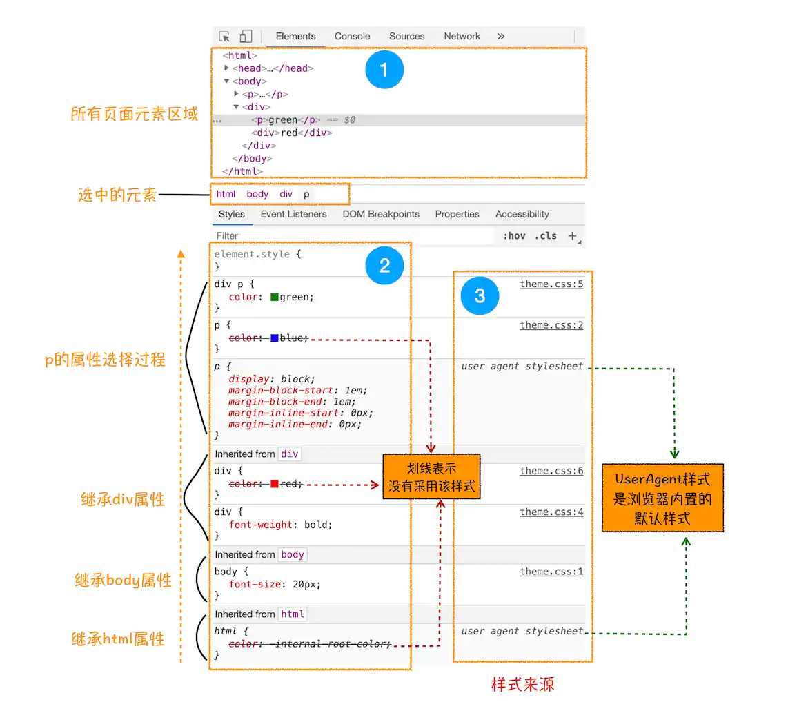 - 最后,可以通过区域 2 和区域 3 来查看样式继承的具体过程。