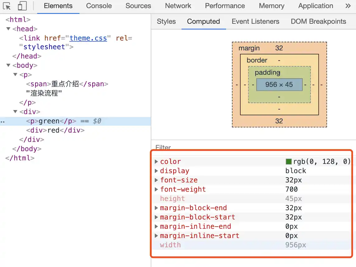 从图中可以看出,所有子节点都继承了父节点样式。比如 body 节点的 font-size 属性是 20,那 body 节点下面的所有节点的 font-size 都等于 20。