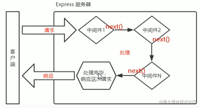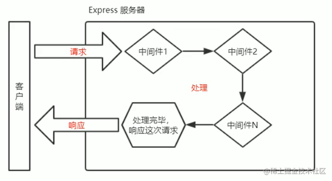 当一个请求到达 Express 的服务器之后,可以连续调用多个中间件,从而对这次请求进行预处理。