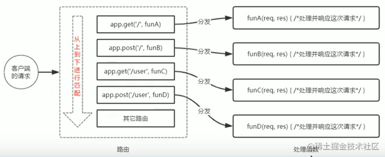 每当一个请求到达服务器之后,需要先经过路由的匹配,只有匹配成功之后,才会调用对应的处理函数。